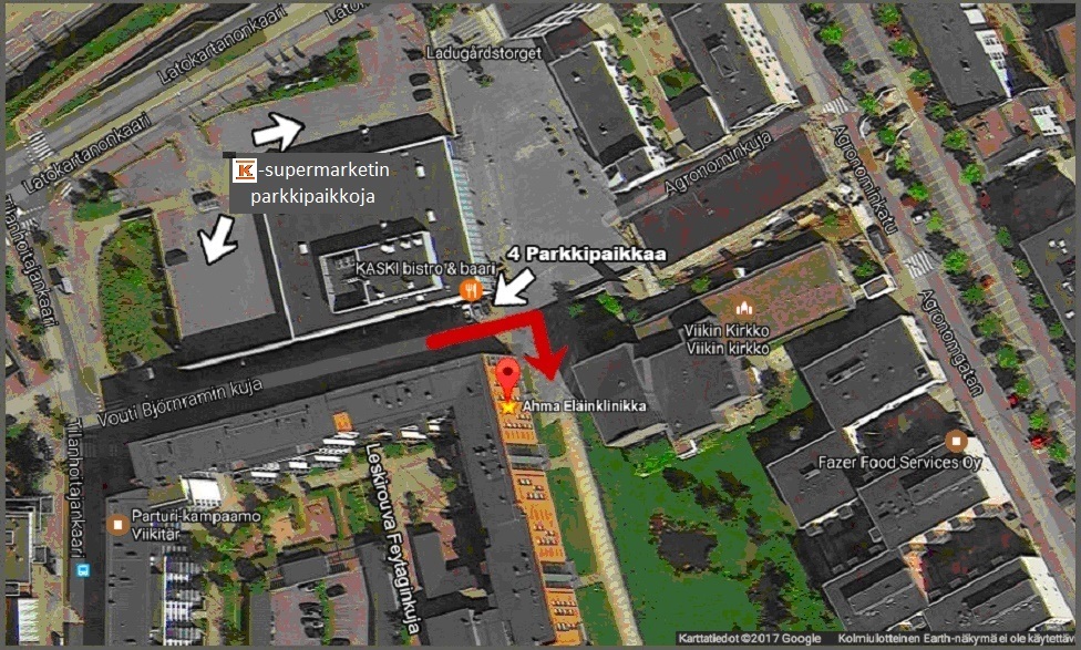 Klinikka löytyy helposti kun kulkee Vouti Björnramin kujan loppuun asti torin aukiolle ja kääntyy oikealle. Ahma Eläinklinikka löytyy alimmassa kerroksessa.